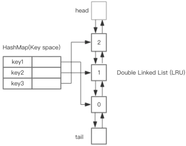 核心思路是,利用双向链表存储键值对,哈希表存储键在链表中对应的节点指针,如下图所示