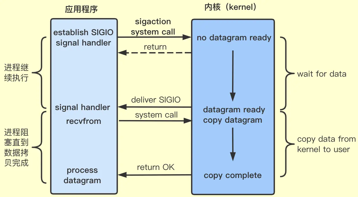 应用进程使用sigaction系统调用,内核立即返回,等到kernel数据准备好时会给用户进程发送一个信号,告诉用户进程可以进行IO操作了,然后用户进程再调用IO系统调用如recvfrom,将数据从内核缓冲区拷贝到应用进程。流程如下:
