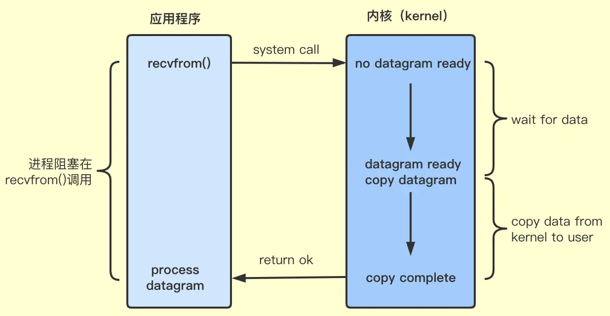 以UDP socket为例,当用户进程调用了recvfrom系统调用,如果数据还没准备好,应用进程被阻塞,内核直到数据到来且将数据从内核缓冲区拷贝到了应用进程缓冲区,然后向用户进程返回结果,用户进程才解除block状态,重新运行起来。