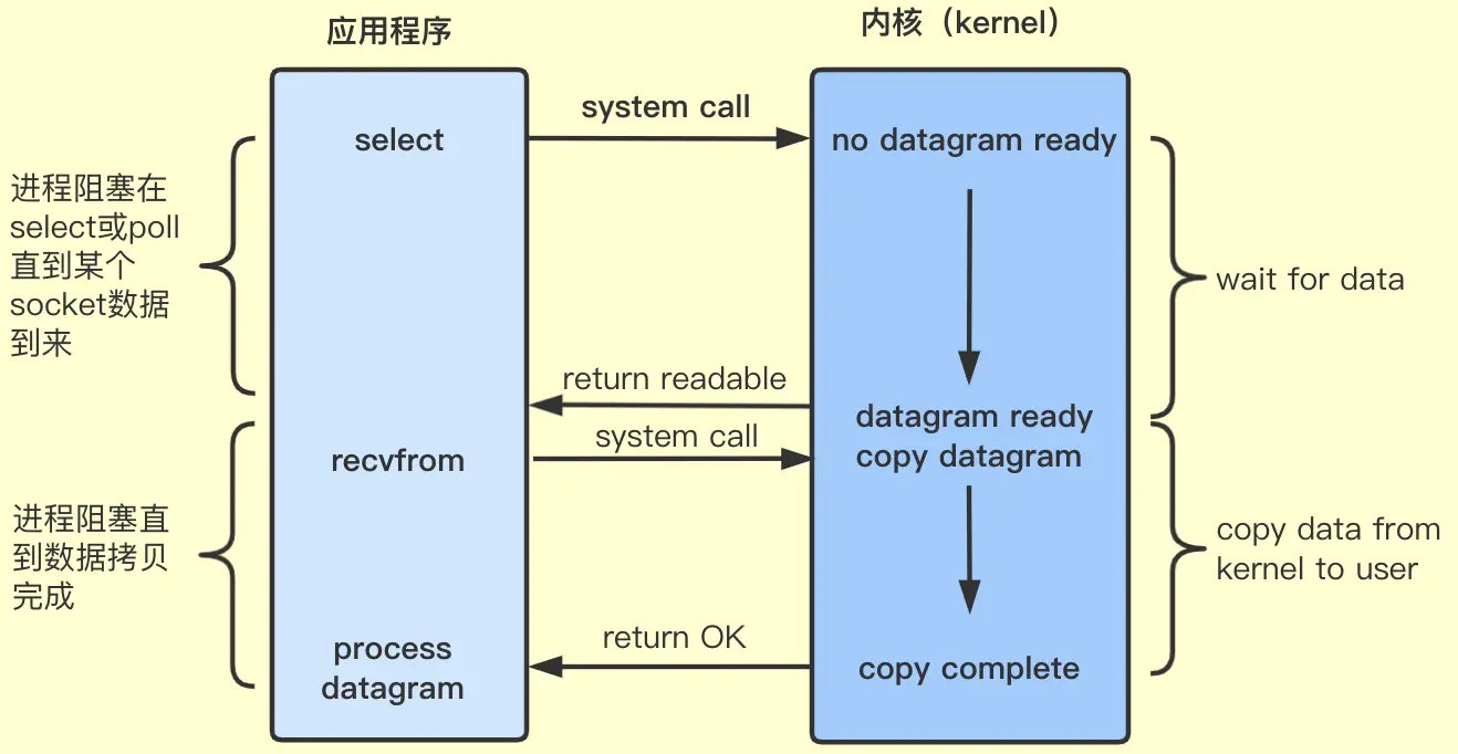 是用select、poll等待数据,可以等待多个socket中的任一个变为可读,这一过程会被阻塞,当某个套接字数据到来时返回,之后再用recvfrom系统调用把数据从内核缓存区复制到用户进程,流程如下: