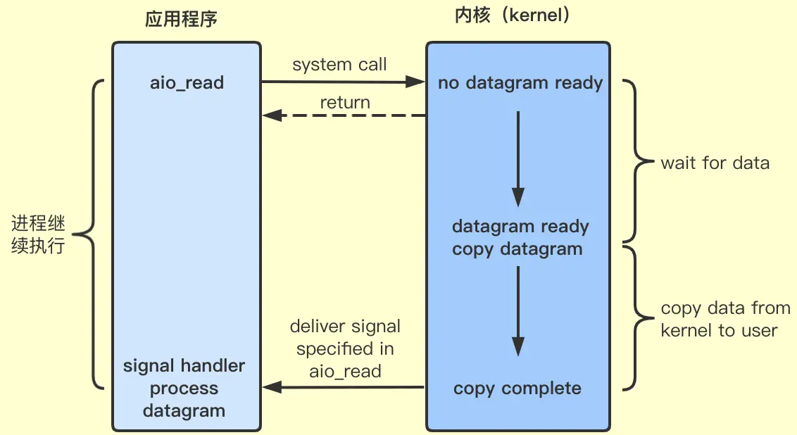 异步IO模型与其他模型最大的区别是,异步IO在系统调用返回的时候所有操作都已经完成,应用进程既不需要等待数据准备,也不需要在数据到来后等待数据从内核缓冲区拷贝到用户缓冲区,流程如下: