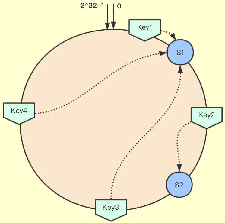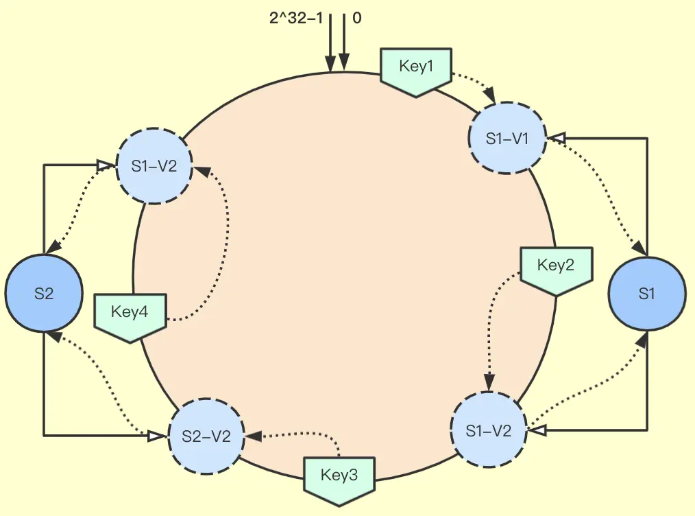 如上图所示,对S1和S2分别虚拟出两个节点,形成四个虚拟节点,数据分配方式不变,不过多了先顺时针找到服务器的虚拟节点,再映射到对应的物理服务器节点。
