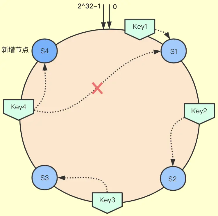 新增了节点S4,那么影响的只是哈希空间S3到S4之间的数据,如原来key4是分配到节点S1,现在分配到了S4。