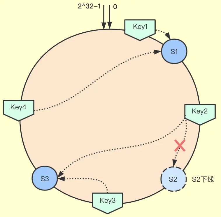 节点S2下线,只影响哈希空间S1到S2之间的数据,如原来key2分配到了S2,现在分配到了S3。