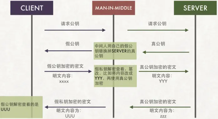如果服务端直接将公钥发给客户端,中间可能被坏人劫持,返回一个假公钥,客户端使用假公钥进行加密后请求,坏人就可以使用假私钥解出明文,篡改内容后再使用真公钥加密后请求到服务器,这时服务器拿到的是被篡改后的数据。